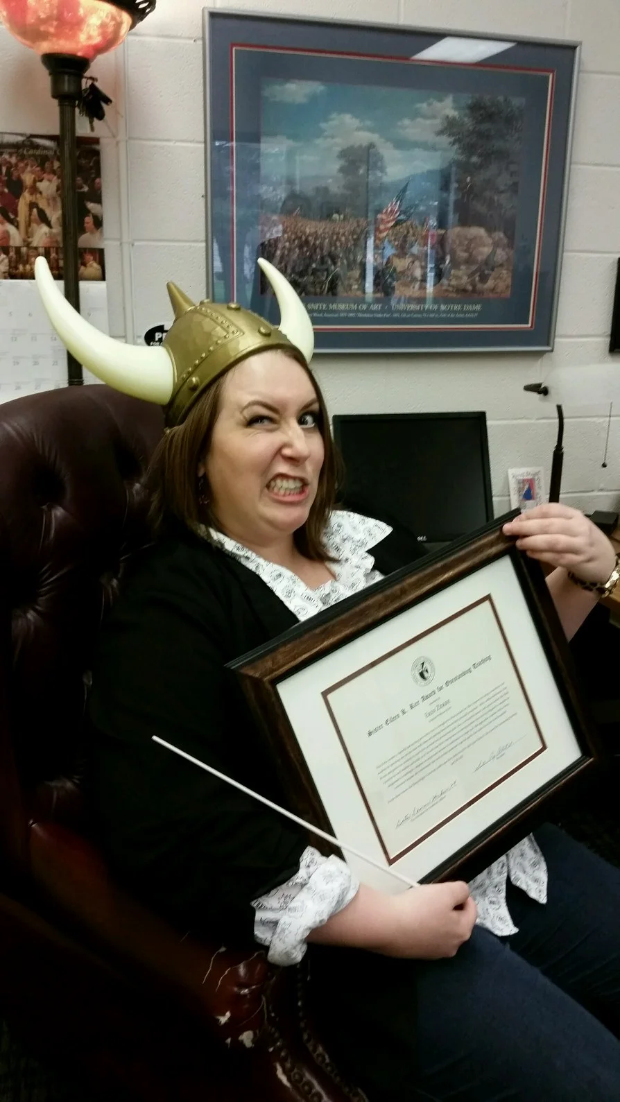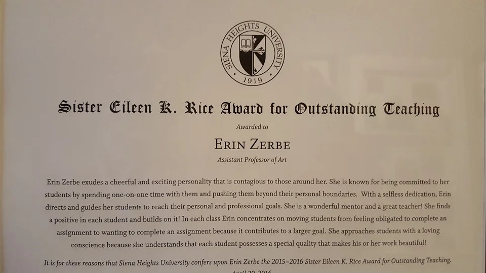 I definitely may have yelled that when Dean Schersten called me up on the stage during this years Honor's Convocation to receive the Eileen K. Rice Award for Outstanding Teaching at Siena Heights University. I don't always take surprises well. For those not familiar with the award or with SHU, here is a small statement about the selection process: