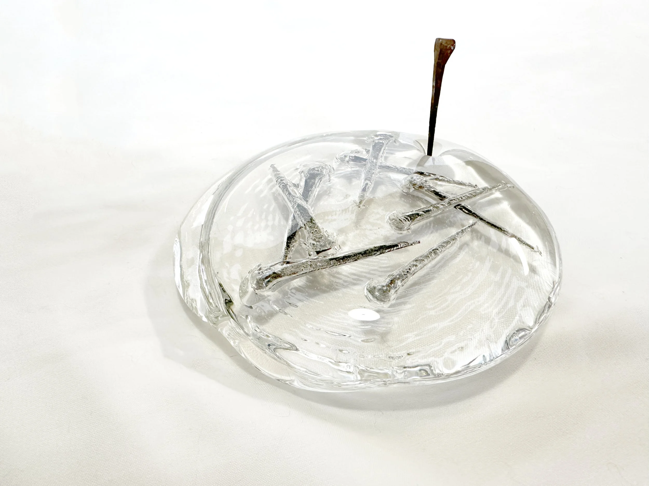 Many of the works in this new series are inspired by my recent divorce. The works explore the liminality of a marriage falling apart, and the transformation that comes from profound pain and grief. This first work in this series touches on many of those elements. The piece is created with handcrafted nails embedded in clear molten glass. While the glass is liquid hot (approximately 2000 degrees) I carefully embedded the final nail, creating a small puncture for it rest. Below is a brief statement about this piece.