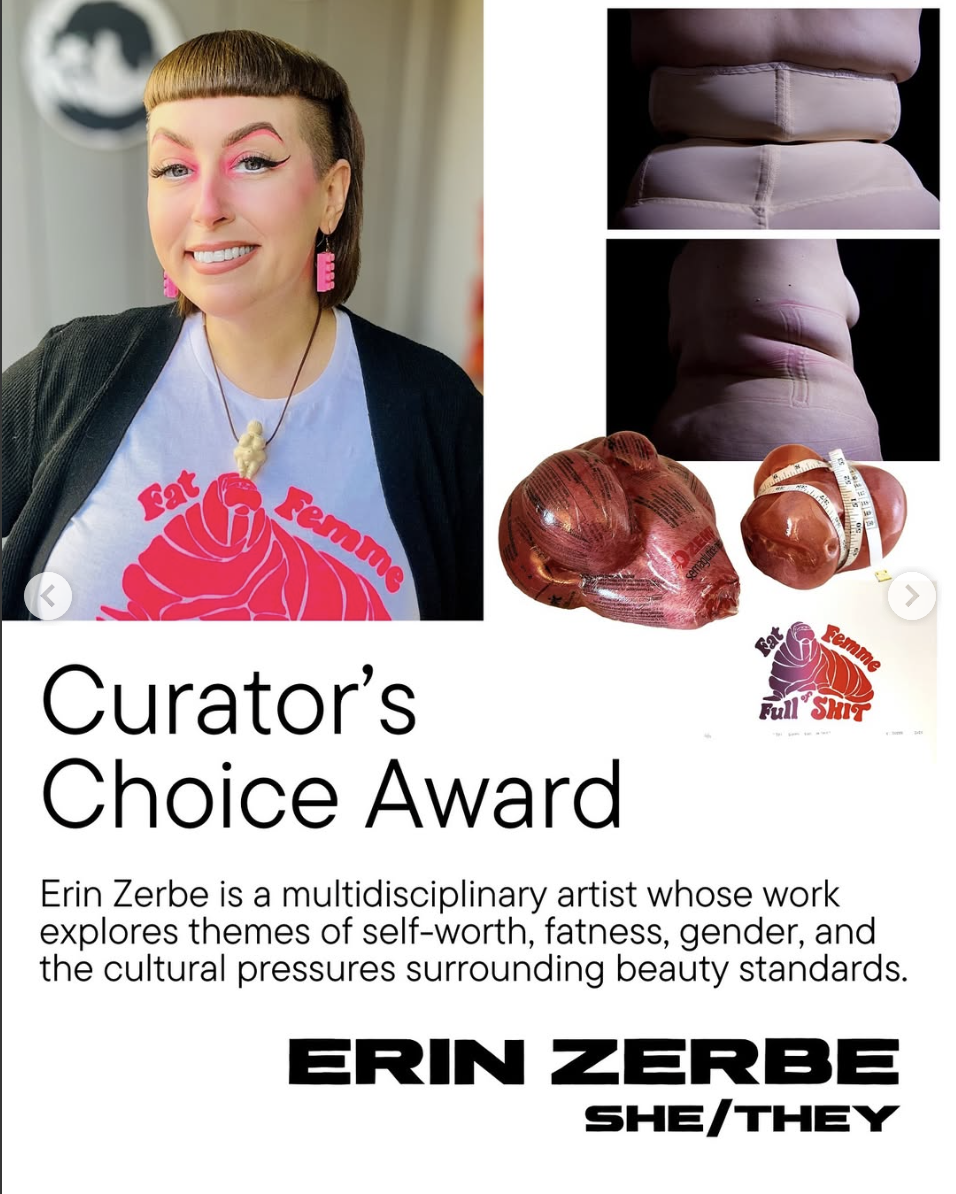 “We are honored to award you the Curator’s Choice Award for your impactful and multi-dimensional works in FAT: A Fat Liberation Gallery Show. Your ability to work across mediums while maintaining such clear, radical intention is extraordinary. Your pieces helped shape the entire emotional arc of the show. From humor to heartbreak, your work communicated so much about fatness, trauma, and autonomy with clarity and power. We’re so grateful you shared these stories with us.”