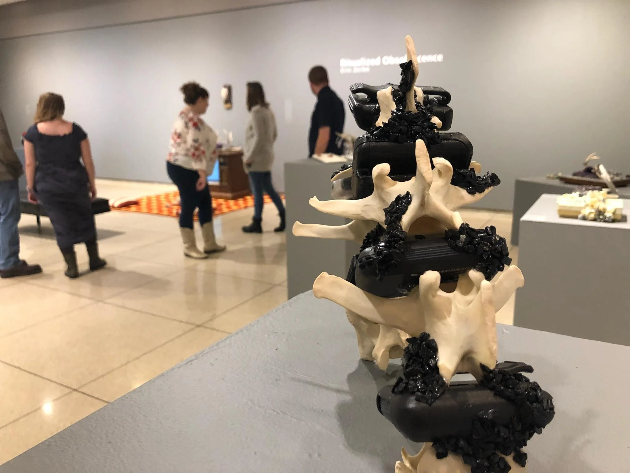 This body of work seeks to explore the convergence of archaic technology and archaic spiritual practices focused on earth-based religions. These sacred object sculptures, or "talismans" combine natural and found objects paired with discarded, broken, and obsolete tech items. These specific pairings have been chosen based on the lingering symbols the natural objects held in many pagan traditions, coupled with the former use of the technology, thus creating a new, modern sacred object that straddles the liminal space between ancient traditions and modern ones. By combining objects that were discarded due to planned obsolescence or newer emerging technologies, I am calling attention to how quickly our tech transitions from treasure to trash and the impermanence it has in our lives. However, like the crystalline forms in many of the pieces, these tech objects are made of materials that will far outlive us and continue to impact our planet long after we are gone.